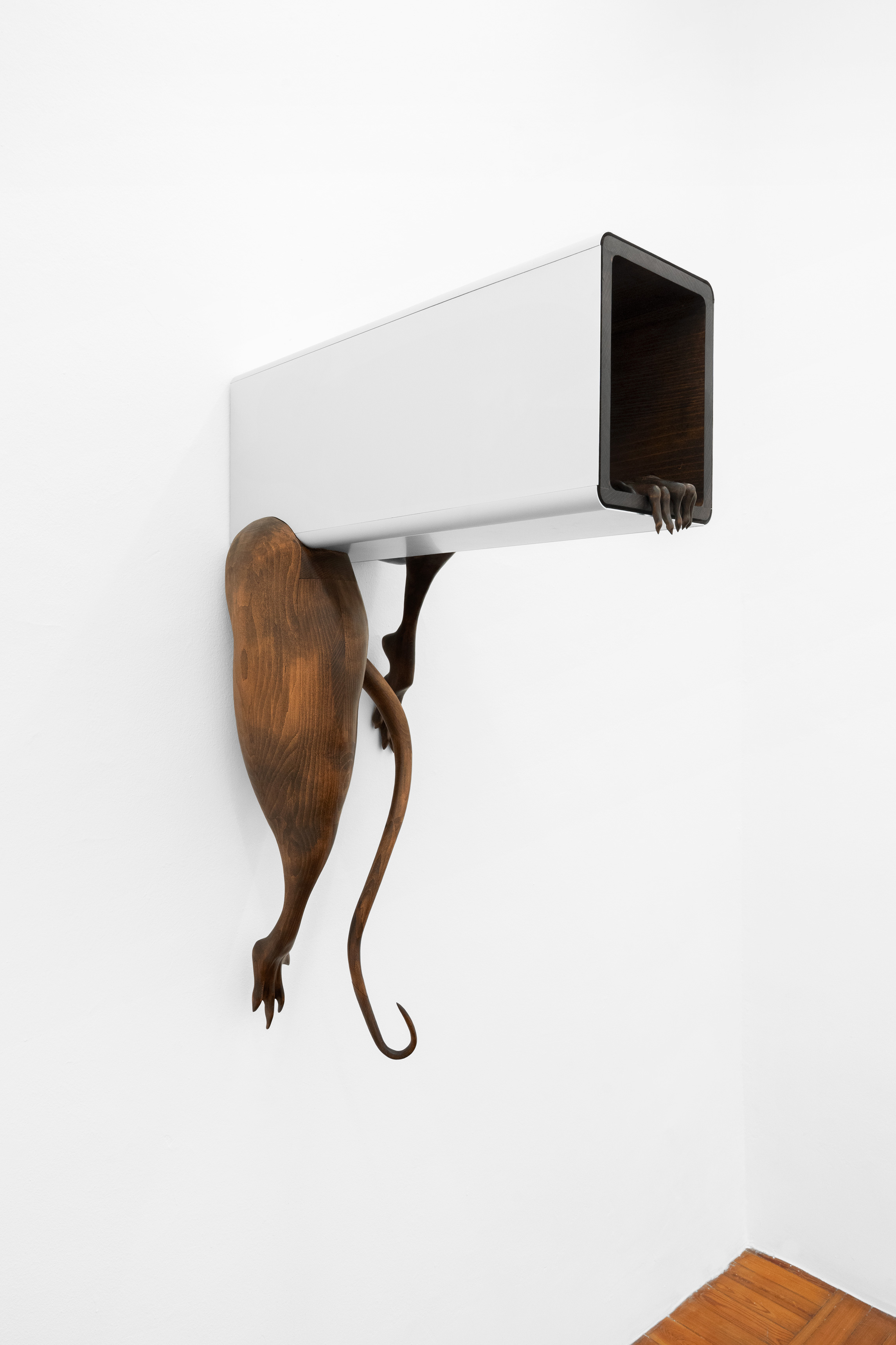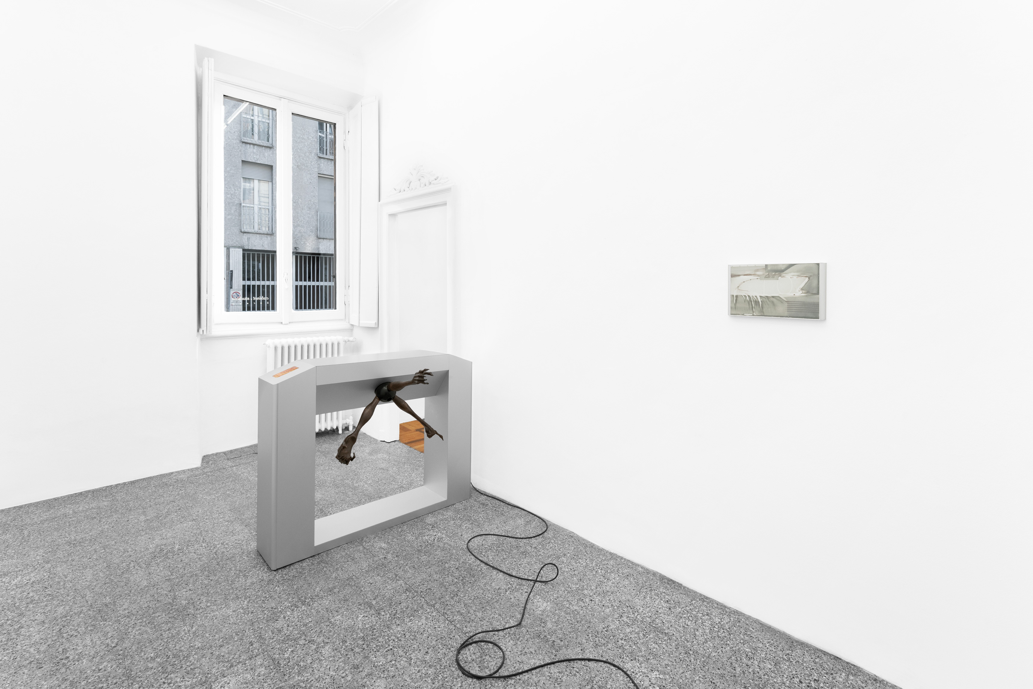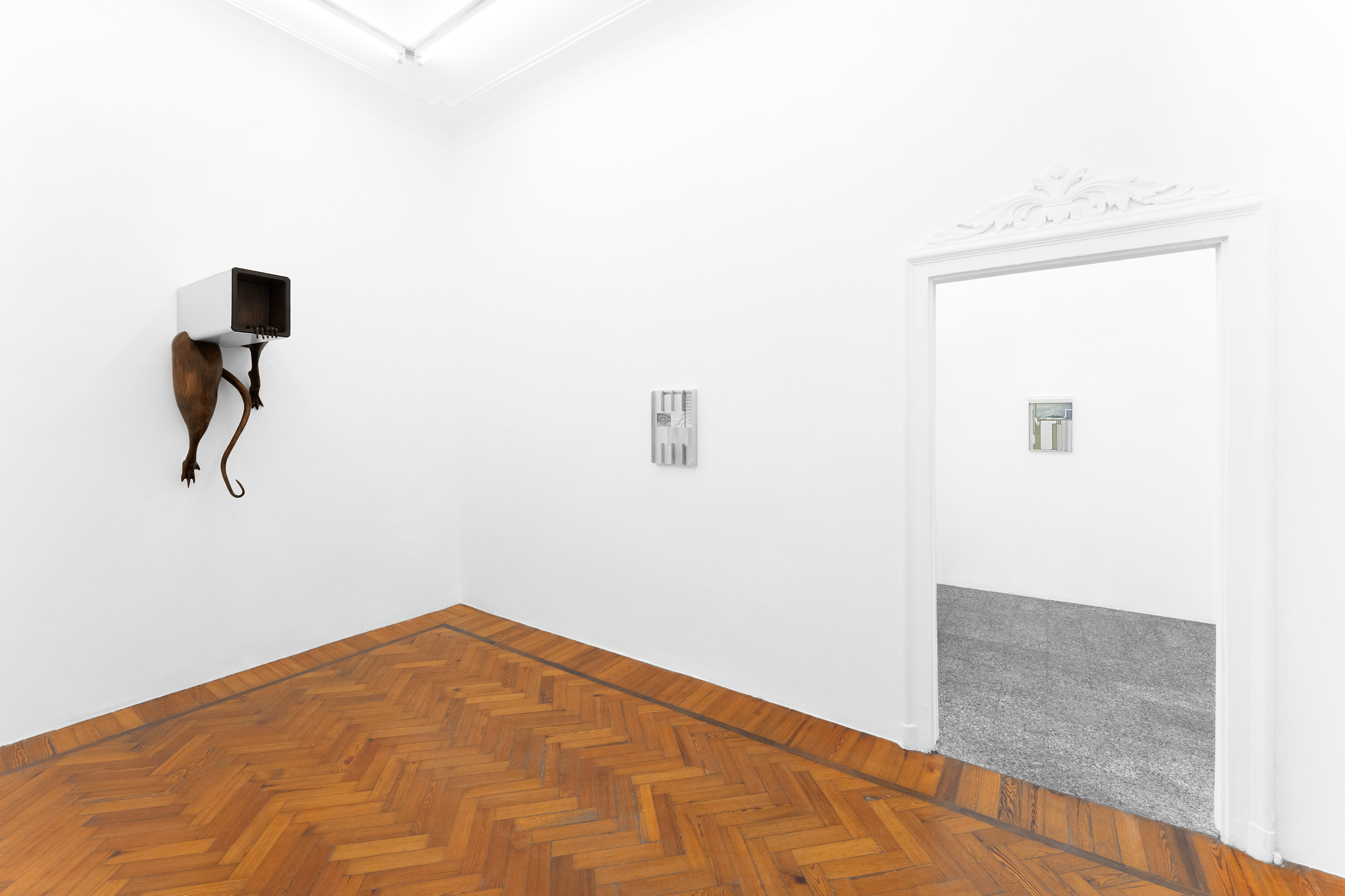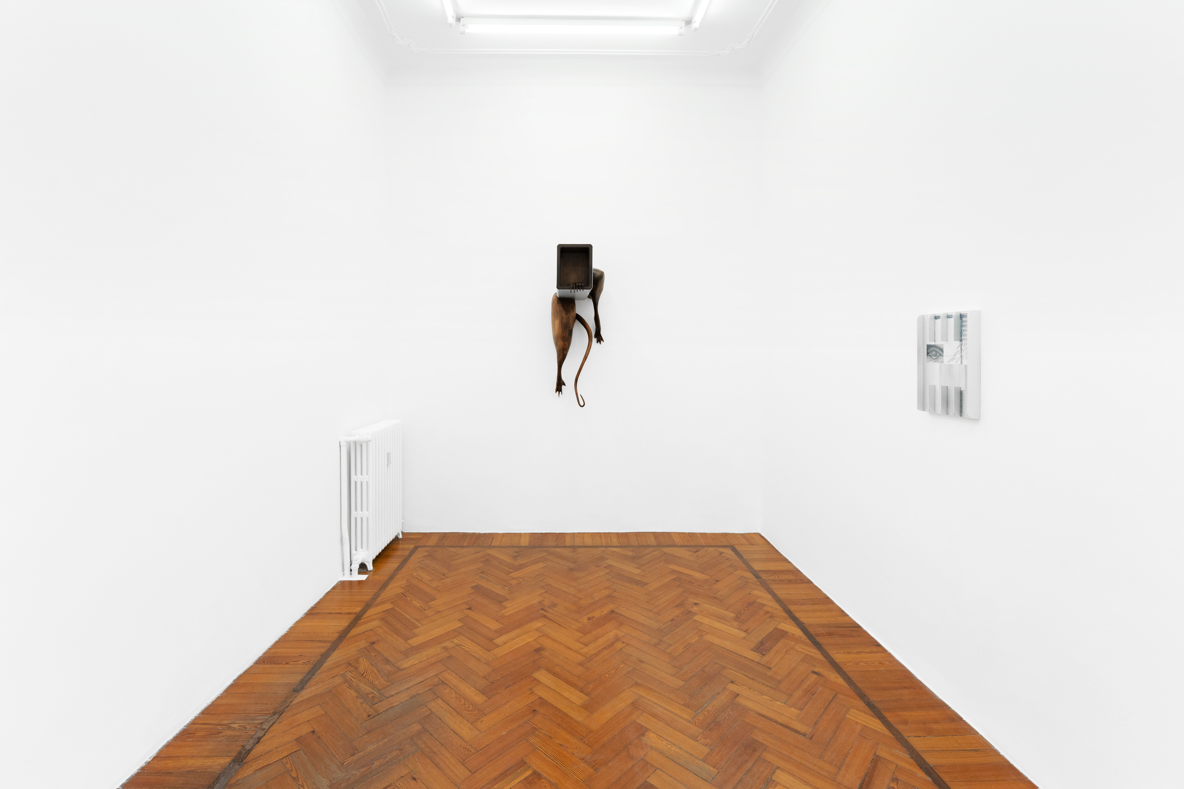 Questa figura, in mostra, prende forme differenti e ci accompagna in un percorso di progressiva manifestazione; se nella prima stanza, con una suspense hitchcockiana, l’artista ci avvisa della sua presenza lasciandoci alcune tracce nascoste ma inequivocabili, come “Apple” – un torsolo di mela rosicchiato realizzato in legno di faggio – nella seconda la nostra supposizione diventa certezza. “Stryge #6” si staglia appeso sulla parete allo stesso modo di un contemporaneo gargoyle, benché le sue fattezze non ci ricordano i decori grotteschi di una cattedrale ma le superfici levigate e traslucide proprio di un’architettura modernista; dentro questa conduttura scivolano le forme di un essere misterioso tra l’uomo e il roditore, completando questa sorta di opera-summa che raccoglie a sé tutti concetti che ruotano intorno questa mostra. Tra le due stanze, “Stryge #5” – opera dalle fattezze di un vero tornello metropolitano i cui bracci hanno però la forma di enigmatici arti lignei – funge da filtro, un ideale portale verso questo mondo a noi estraneo; depotenziato dal suo valore prettamente didascalico (per via della sua posizione ribaltata e fuori asse rispetto al vero passaggio), l’opera si anima soltanto se il nostro corpo entra in contatto con queste presenze “altre”... come se l’artista ci stesse invitando ad un gesto metaforico di confronto e superamento delle nostre paure. Completano la mostra quattro dipinti ad aerografo su alluminio anodizzato intitolati “H&S (Atomic Purple)”; ispirato all’omonimo modello di Game Boy del 1998 (la cui scocca in plastica trasparente lasciava intravedere gli organi tecnologici della console tascabile), rappresentano una combinazione di piccole figure o frammenti del corpo uniti a trame di cavi e altre tubature infrastrutturali sotterranee, “paesaggi” di cui l’artista ha potuto fare esperienza diretta per via di un grande scavo metropolitano proprio davanti la porta del suo studio di Aubervilliers.