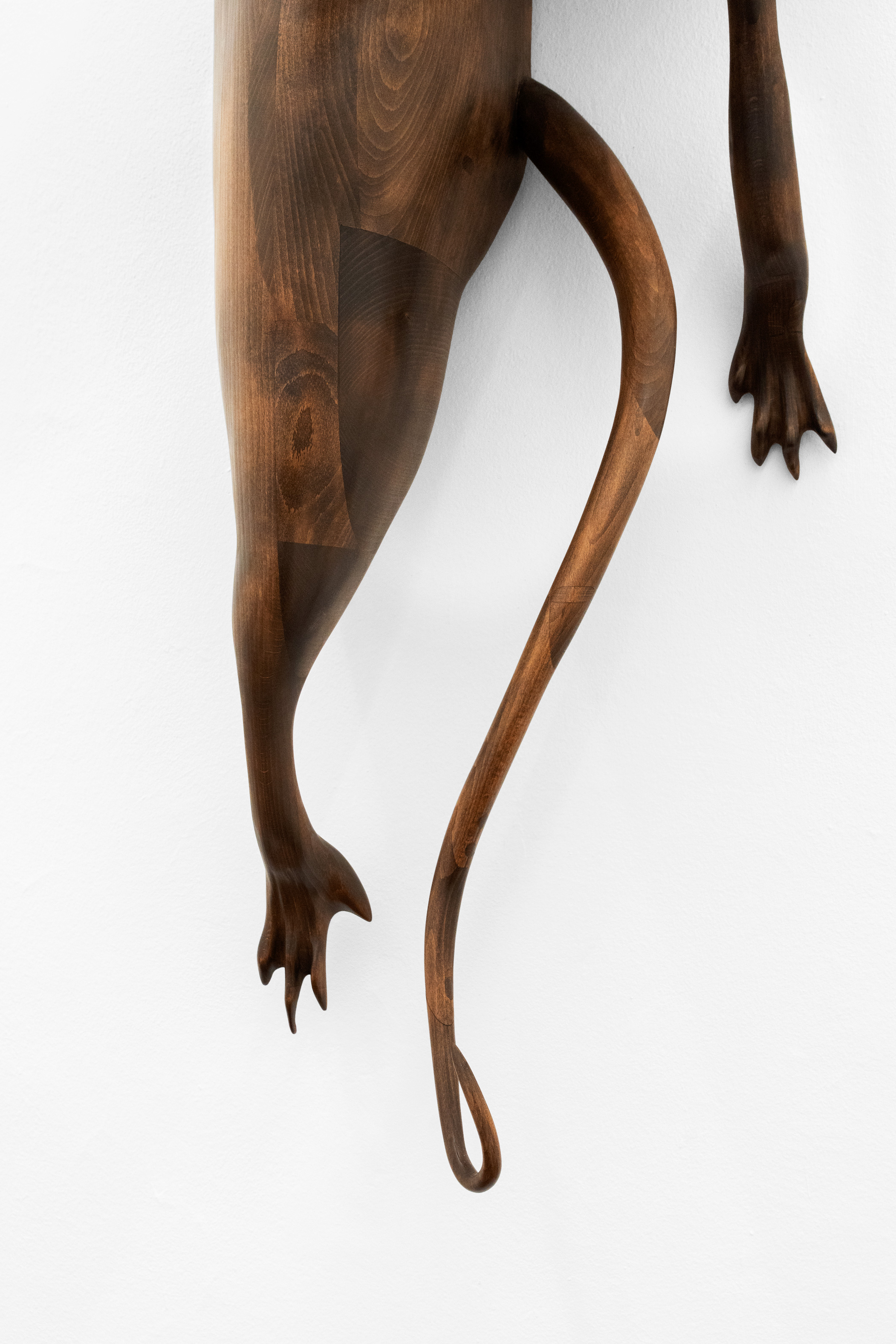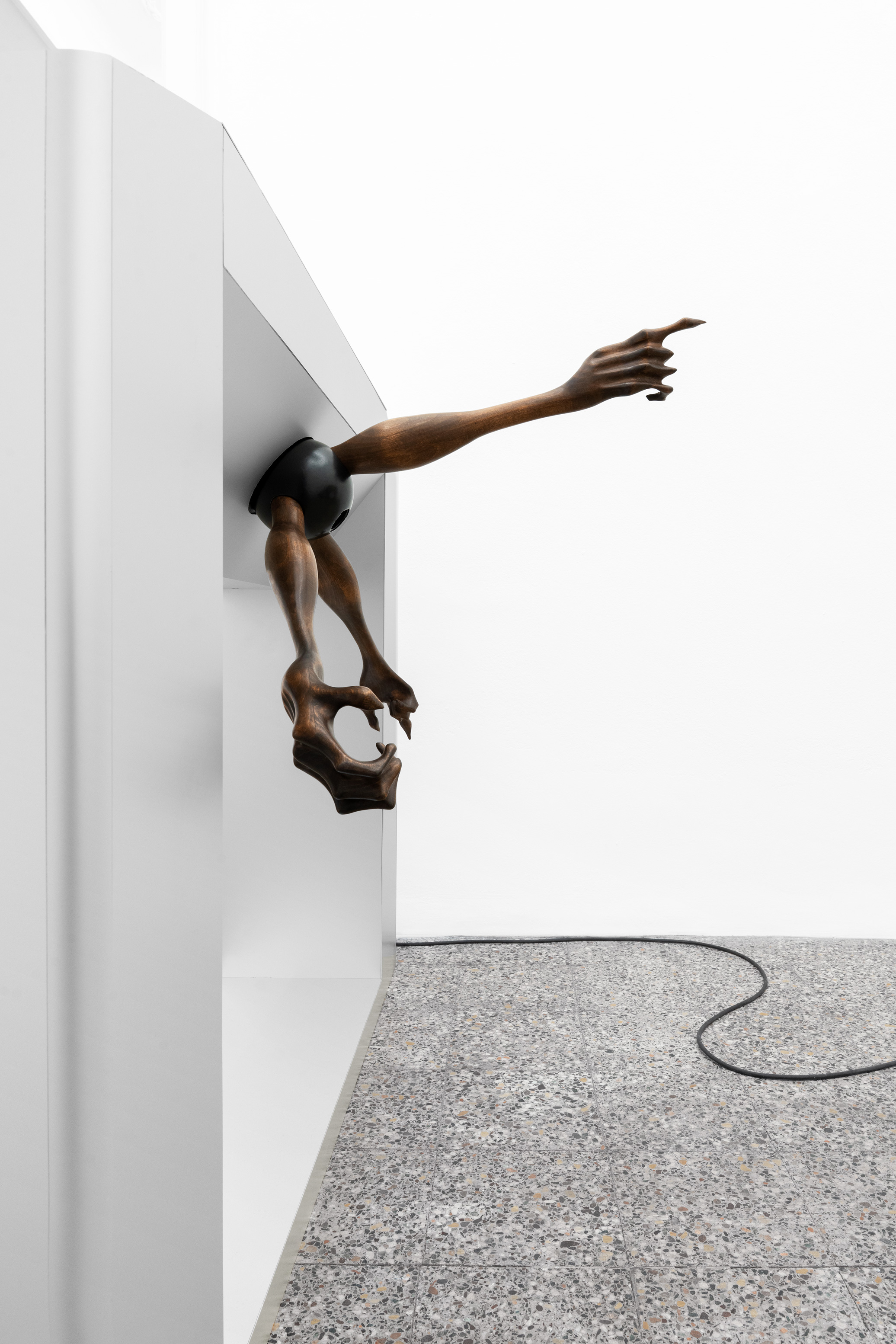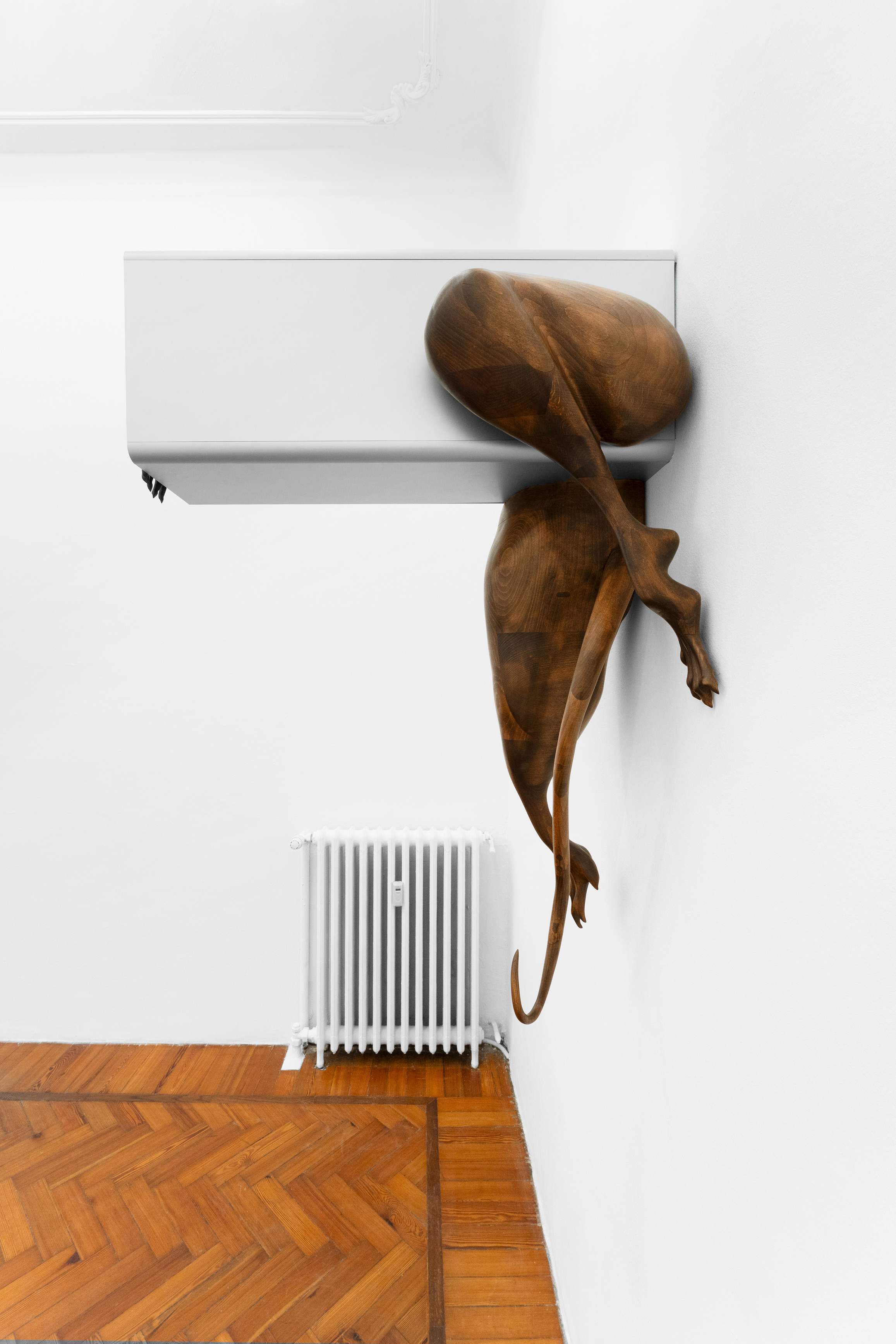 Questa figura, in mostra, prende forme differenti e ci accompagna in un percorso di progressiva manifestazione; se nella prima stanza, con una suspense hitchcockiana, l’artista ci avvisa della sua presenza lasciandoci alcune tracce nascoste ma inequivocabili, come “Apple” – un torsolo di mela rosicchiato realizzato in legno di faggio – nella seconda la nostra supposizione diventa certezza. “Stryge #6” si staglia appeso sulla parete allo stesso modo di un contemporaneo gargoyle, benché le sue fattezze non ci ricordano i decori grotteschi di una cattedrale ma le superfici levigate e traslucide proprio di un’architettura modernista; dentro questa conduttura scivolano le forme di un essere misterioso tra l’uomo e il roditore, completando questa sorta di opera-summa che raccoglie a sé tutti concetti che ruotano intorno questa mostra. Tra le due stanze, “Stryge #5” – opera dalle fattezze di un vero tornello metropolitano i cui bracci hanno però la forma di enigmatici arti lignei – funge da filtro, un ideale portale verso questo mondo a noi estraneo; depotenziato dal suo valore prettamente didascalico (per via della sua posizione ribaltata e fuori asse rispetto al vero passaggio), l’opera si anima soltanto se il nostro corpo entra in contatto con queste presenze “altre”... come se l’artista ci stesse invitando ad un gesto metaforico di confronto e superamento delle nostre paure. Completano la mostra quattro dipinti ad aerografo su alluminio anodizzato intitolati “H&S (Atomic Purple)”; ispirato all’omonimo modello di Game Boy del 1998 (la cui scocca in plastica trasparente lasciava intravedere gli organi tecnologici della console tascabile), rappresentano una combinazione di piccole figure o frammenti del corpo uniti a trame di cavi e altre tubature infrastrutturali sotterranee, “paesaggi” di cui l’artista ha potuto fare esperienza diretta per via di un grande scavo metropolitano proprio davanti la porta del suo studio di Aubervilliers.