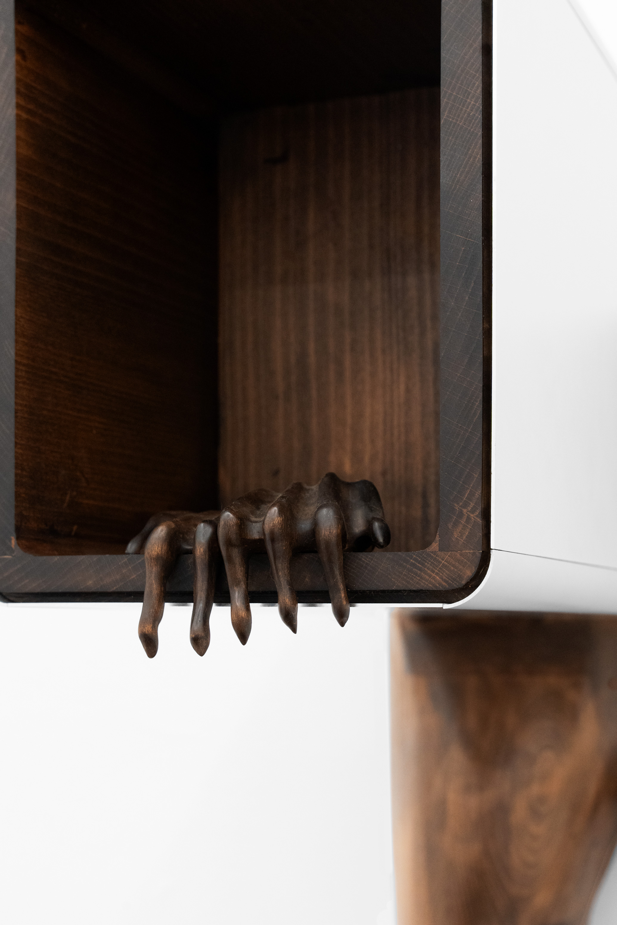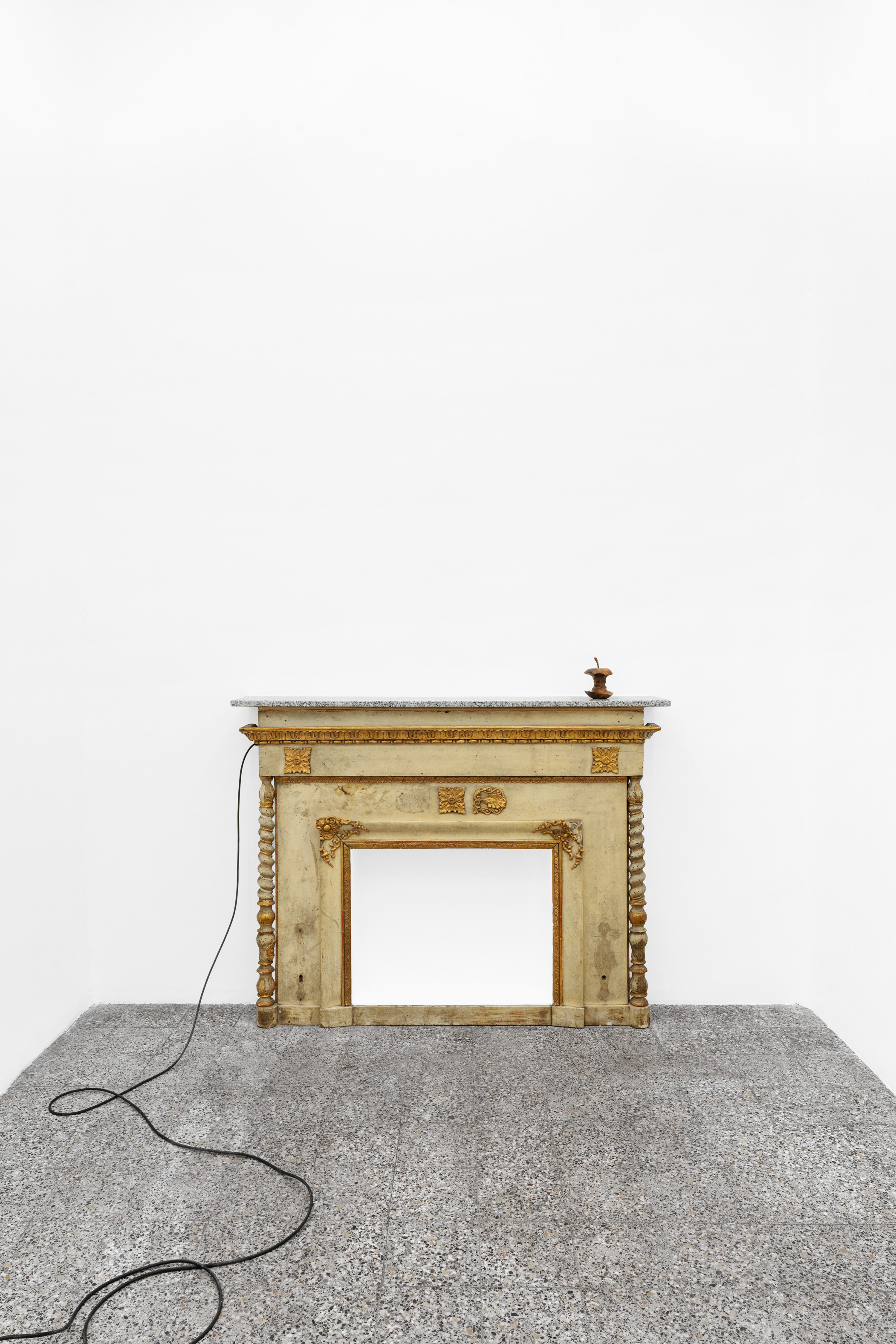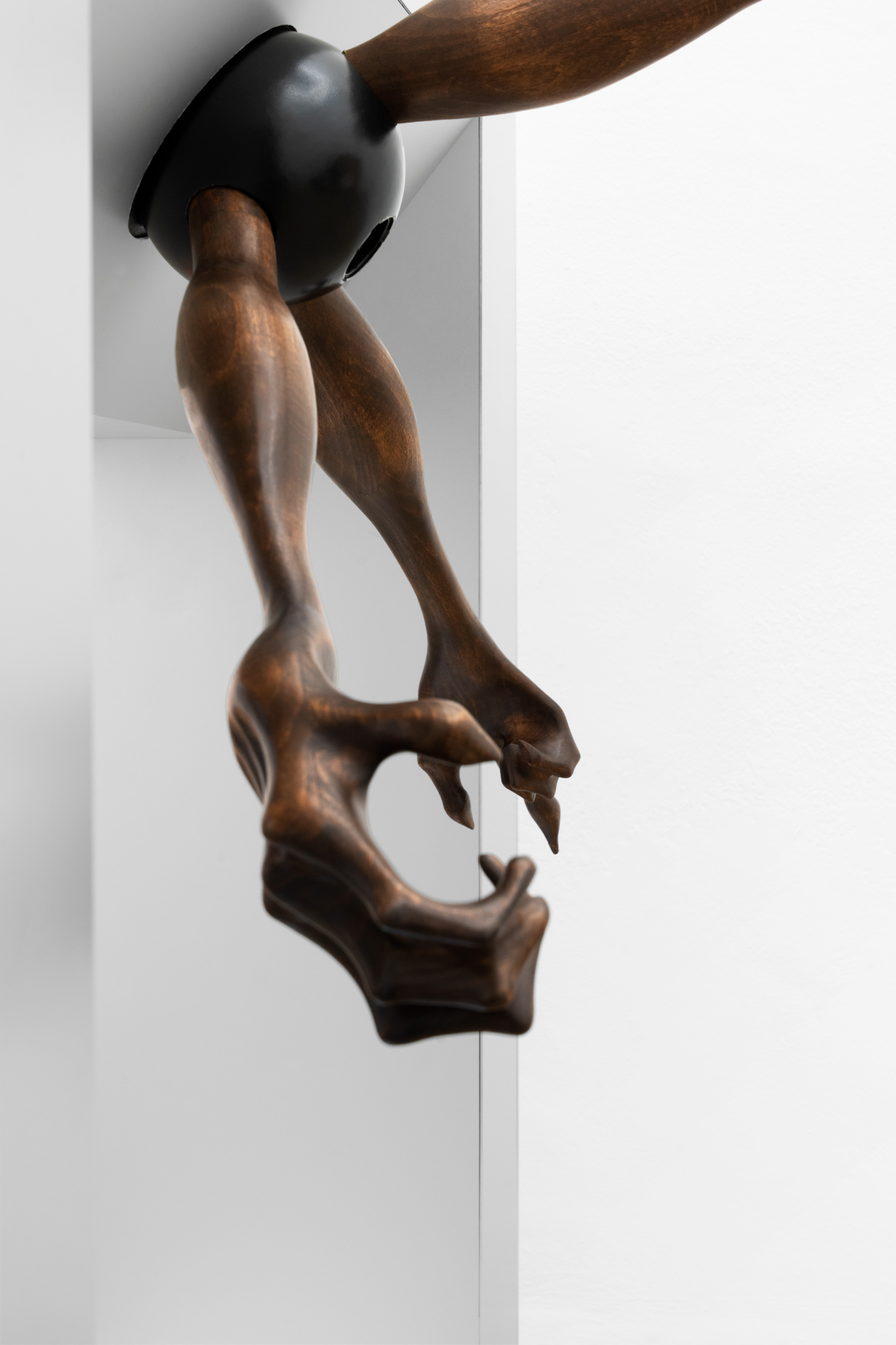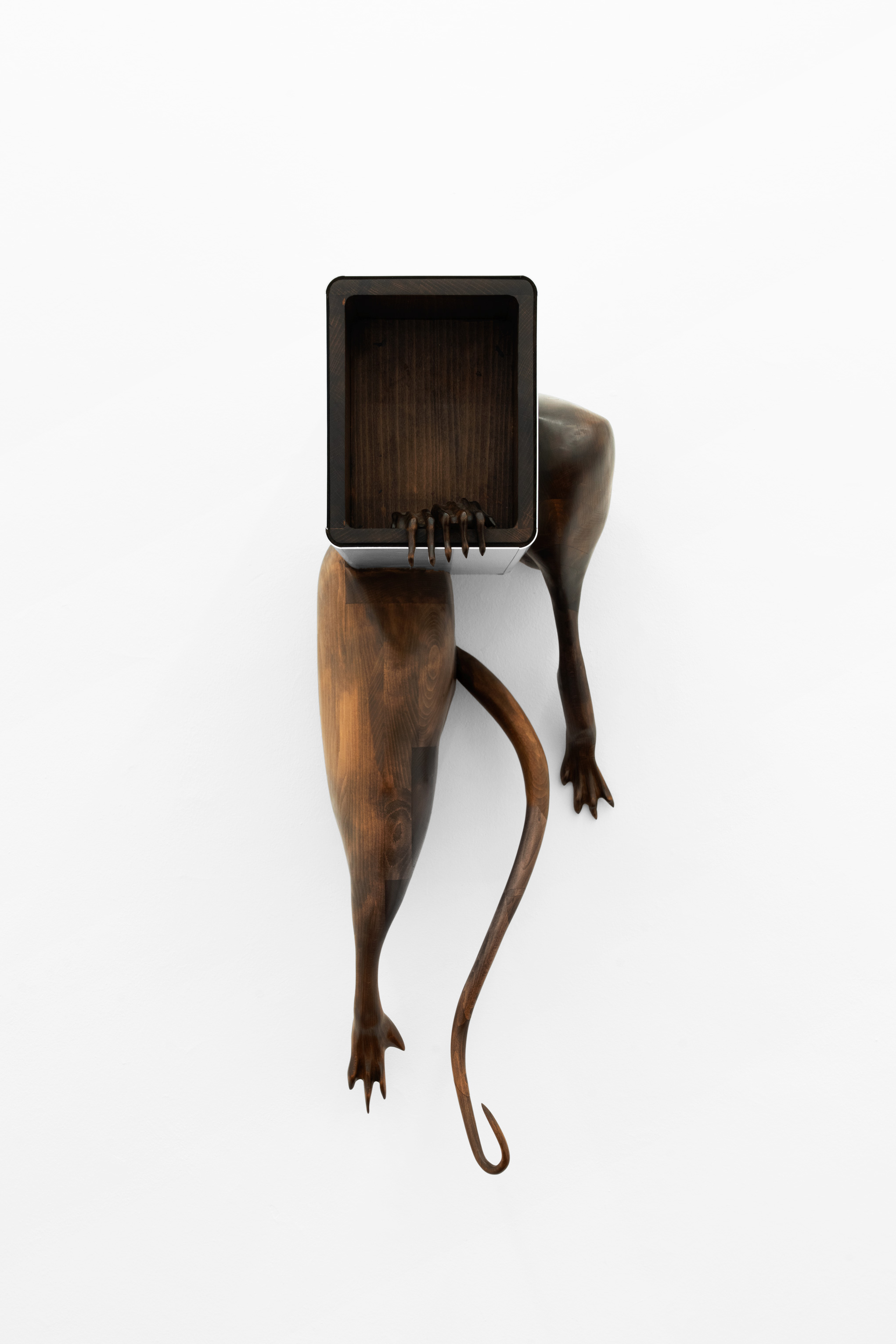 Questa figura, in mostra, prende forme differenti e ci accompagna in un percorso di progressiva manifestazione; se nella prima stanza, con una suspense hitchcockiana, l’artista ci avvisa della sua presenza lasciandoci alcune tracce nascoste ma inequivocabili, come “Apple” – un torsolo di mela rosicchiato realizzato in legno di faggio – nella seconda la nostra supposizione diventa certezza. “Stryge #6” si staglia appeso sulla parete allo stesso modo di un contemporaneo gargoyle, benché le sue fattezze non ci ricordano i decori grotteschi di una cattedrale ma le superfici levigate e traslucide proprio di un’architettura modernista; dentro questa conduttura scivolano le forme di un essere misterioso tra l’uomo e il roditore, completando questa sorta di opera-summa che raccoglie a sé tutti concetti che ruotano intorno questa mostra. Tra le due stanze, “Stryge #5” – opera dalle fattezze di un vero tornello metropolitano i cui bracci hanno però la forma di enigmatici arti lignei – funge da filtro, un ideale portale verso questo mondo a noi estraneo; depotenziato dal suo valore prettamente didascalico (per via della sua posizione ribaltata e fuori asse rispetto al vero passaggio), l’opera si anima soltanto se il nostro corpo entra in contatto con queste presenze “altre”... come se l’artista ci stesse invitando ad un gesto metaforico di confronto e superamento delle nostre paure. Completano la mostra quattro dipinti ad aerografo su alluminio anodizzato intitolati “H&S (Atomic Purple)”; ispirato all’omonimo modello di Game Boy del 1998 (la cui scocca in plastica trasparente lasciava intravedere gli organi tecnologici della console tascabile), rappresentano una combinazione di piccole figure o frammenti del corpo uniti a trame di cavi e altre tubature infrastrutturali sotterranee, “paesaggi” di cui l’artista ha potuto fare esperienza diretta per via di un grande scavo metropolitano proprio davanti la porta del suo studio di Aubervilliers.
