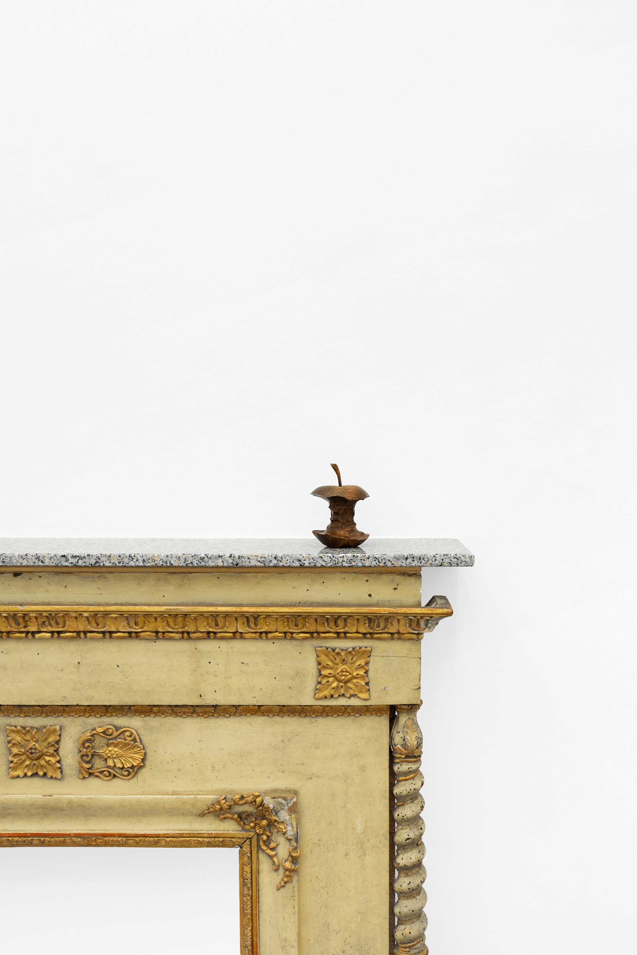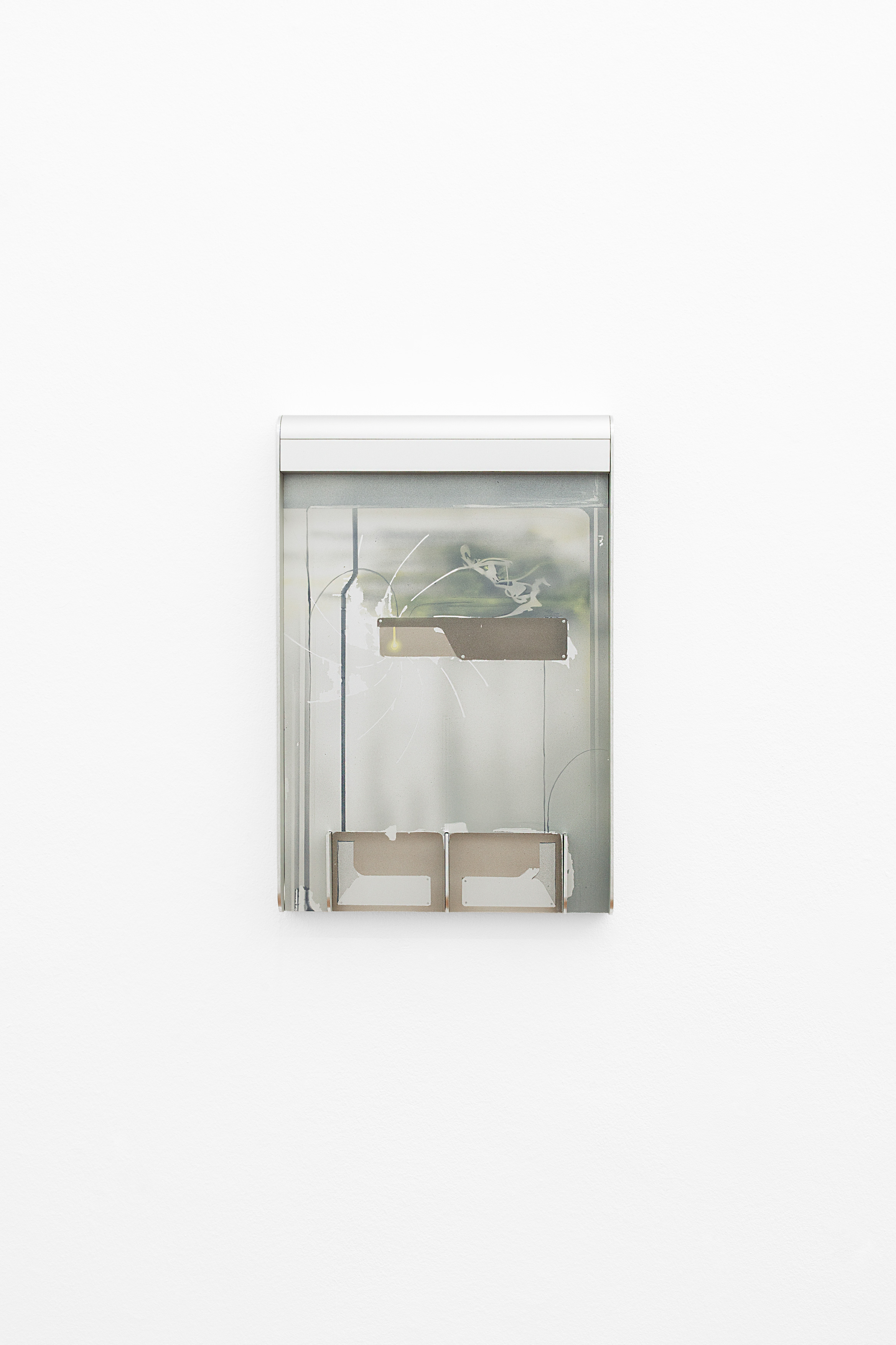 This figure, in the exhibition, takes on different forms and accompanies us in a path of progressive manifestation; if in the first room, with Hitchcockian suspense, the artist warns us of its presence by leaving some hidden but unmistakable traces, such as “Apple” — an apple core gnawed away, made in beech wood — in the second, our supposition becomes certainty. “Stryge #6” stands out hanging on the wall like a contemporary gargoyle, although its features do not recall the grotesque decorations of a cathedral but rather the smooth and translucent surfaces of modernist architecture; within this duct slide the shapes of a mysterious being between man and rodent, completing this sort of summa work that gathers around itself all the concepts revolving around this exhibition. Between the two rooms, “Stryge #5” — a work in the form of a real subway turnstile whose arms, however, take the shape of enigmatic wooden limbs — functions as a filter, an ideal portal to this world foreign to us; deprived of its didactic value (due to its overturned position and off-axis with respect to the real passage), the work comes alive only if our body comes into contact with these “other” presences… as if the artist were inviting us to a metaphorical gesture of confrontation and overcoming of our fears. Completing the exhibition are four airbrush paintings on anodized aluminum entitled “H&S (Atomic Purple)”; inspired by the Game Boy model from 1998 (whose transparent plastic shell allowed one to glimpse the technological organs of the handheld console), they represent a combination of small figures or fragments of the body joined to networks of cables and other underground infrastructural pipes, “landscapes” of which the artist was able to have direct experience due to a large excavation right in front of the door of his studio in Aubervilliers.